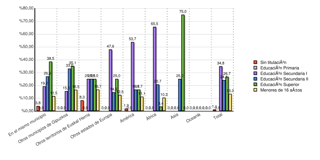 | Continente | Sin titulación | Educación Primaria | Educación Secundaria I | Educación Secundaria II | Educación Superior | Menores de 16 años | Total | |||||||
