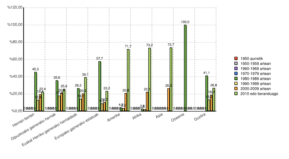 | Euskal Herriko gainerako herrialdeak | 0 | 0,0 | 0 | 0,0 | 0 | 0,0 | 0 | 0,0 | 103 | 26,5 | 55 | 14,1 | 79 | 20,3 | 152 | 39,1 | 389 | 100,0 |