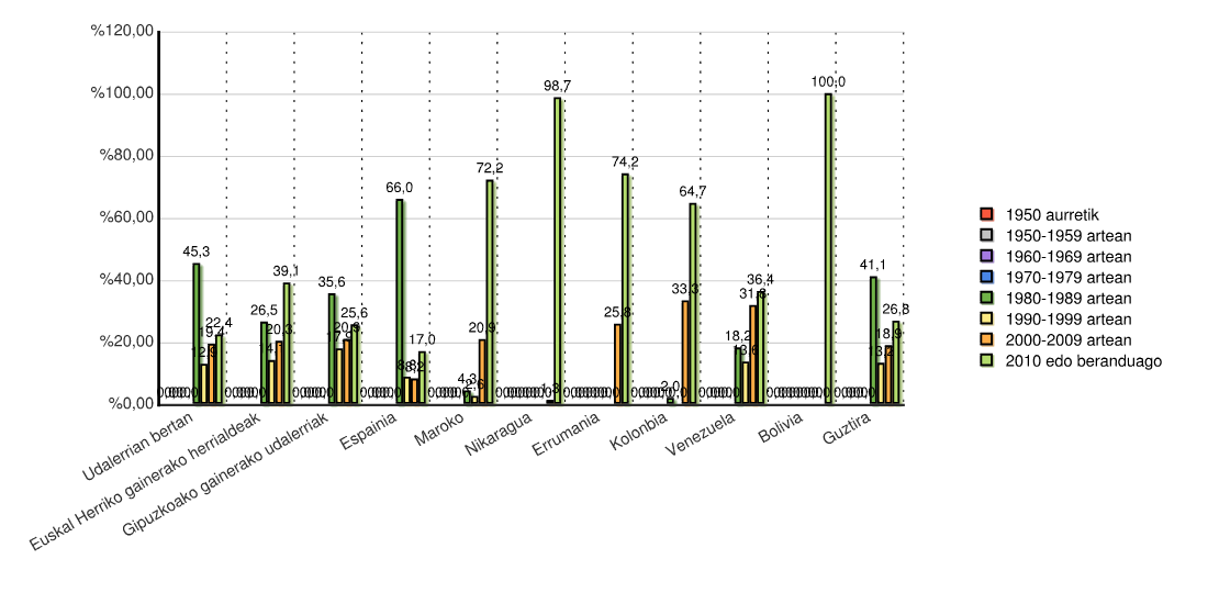 | Euskal Herriko gainerako herrialdeak | 0 | 0,0 | 0 | 0,0 | 0 | 0,0 | 0 | 0,0 | 103 | 26,5 | 55 | 14,1 | 79 | 20,3 | 152 | 39,1 | 389 | 100,0 |