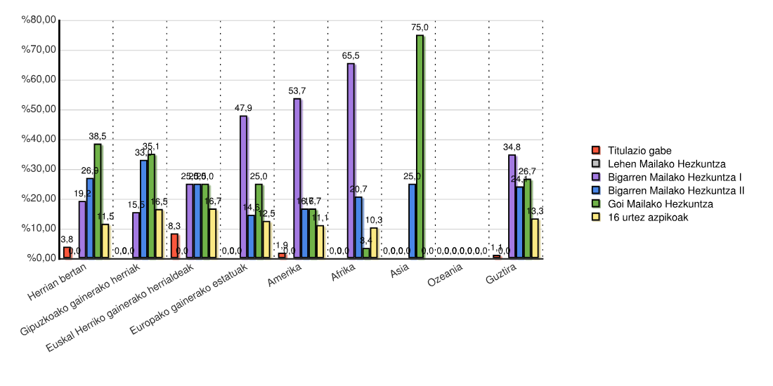 | Kontinentea | Titulazio gabe | Lehen Mailako Hezkuntza | Bigarren Mailako Hezkuntza I | Bigarren Mailako Hezkuntza II | Goi Mailako Hezkuntza | 16 urtez azpikoak | Guztira | |||||||
